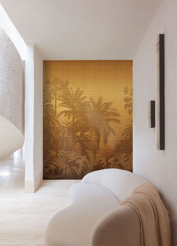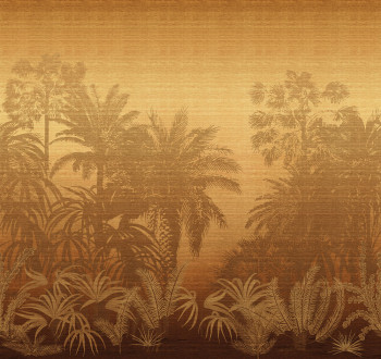 Mural with lightly embossed fabric texture, tropical landscape with palm trees in brown and ochre tones.