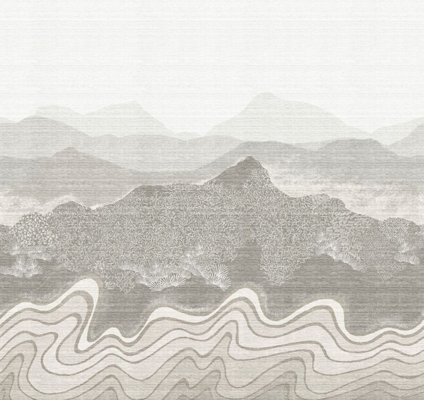 Mural with lightly embossed fabric texture, mountain landscape in shades of grey.