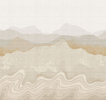 Mural with lightly embossed fabric texture, mountain landscape in shades of grey and beige.