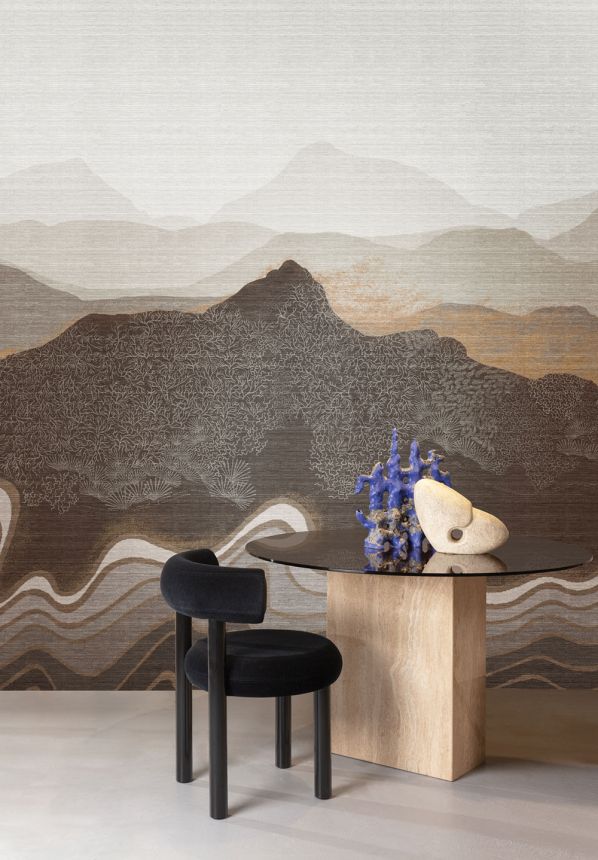 Mural with lightly embossed fabric texture, mountain landscape in shades of brown and grey.