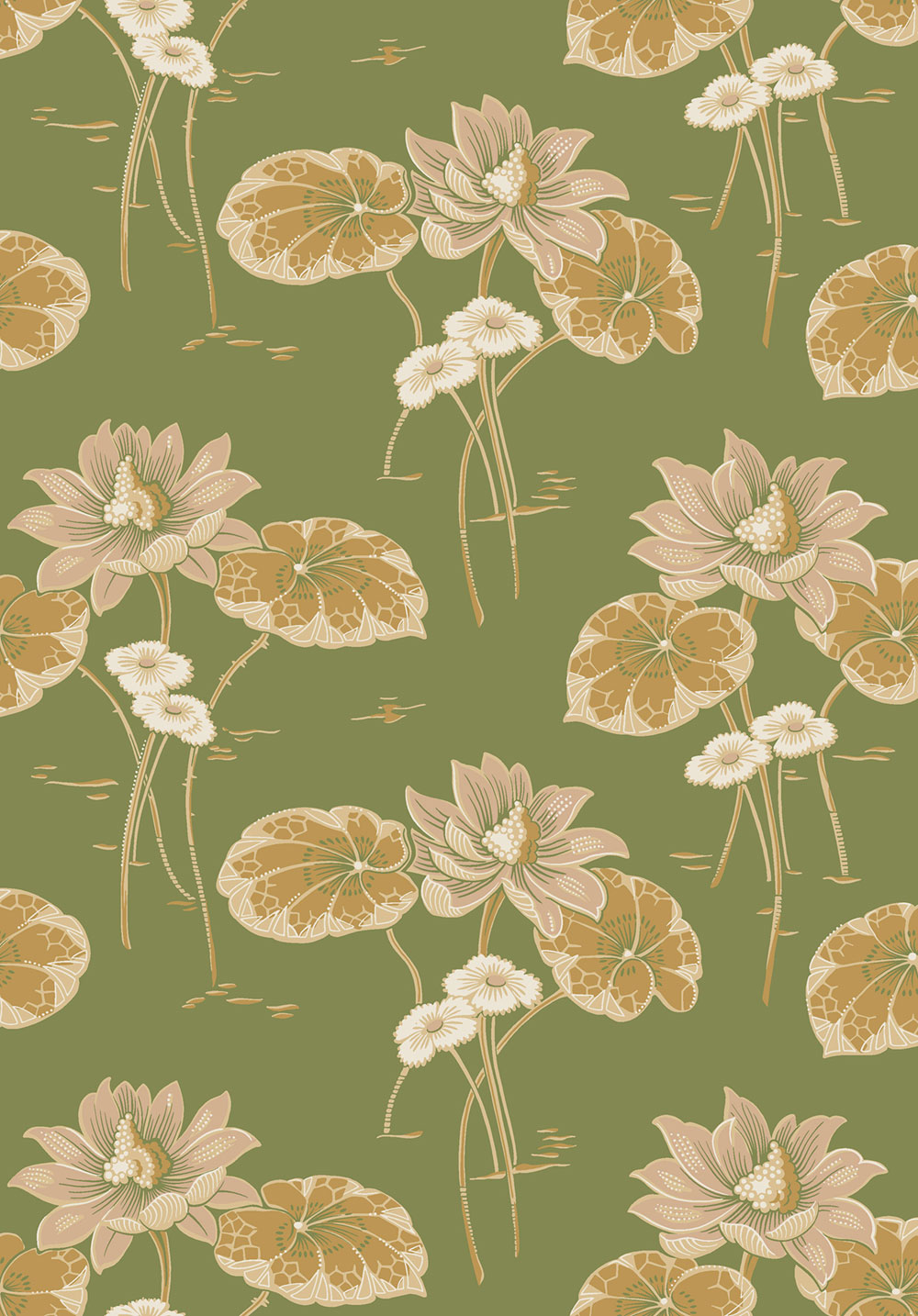 Non-woven wallpaper for the wall, green background, water lily pattern in shades of beige and pink.