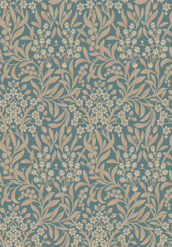 Non-woven wallpaper for the wall, cornflower blue background, floral and leaf pattern in shades of beige and pink.