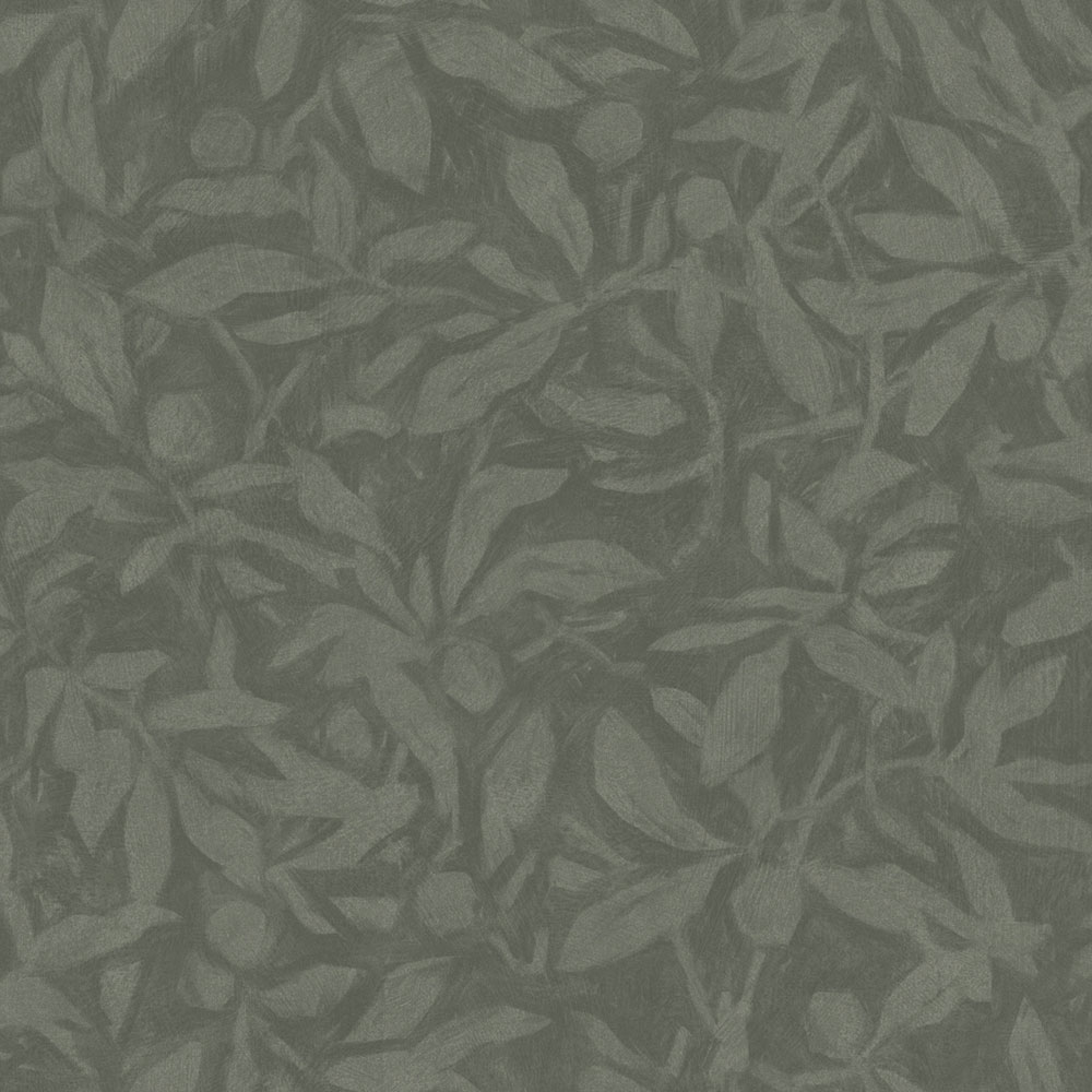 Non-woven wallpaper for the wall, leaf motifs in dark green shades.