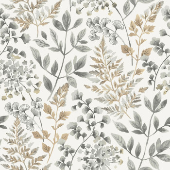 Non-woven wallpaper with a watercolor pattern of ferns, grasses, and leaves in shades of grey and brown.