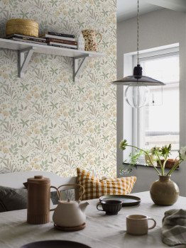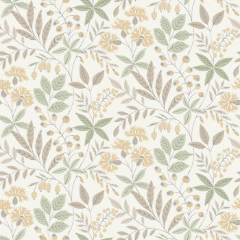 Non-woven wallpaper with a pattern of flowers, leaves and berries in muted shades of beige, ochre and green.