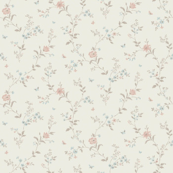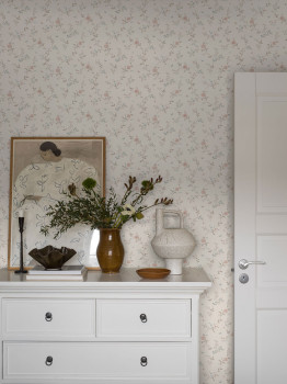 Non-woven wallpaper with a romantic floral pattern in muted shades of beige, pink and blue.