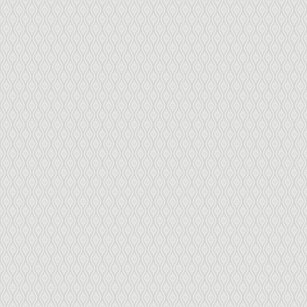 Non-woven wallpaper with a romantic pattern in soft shades of grey and white, with wavy floral design.