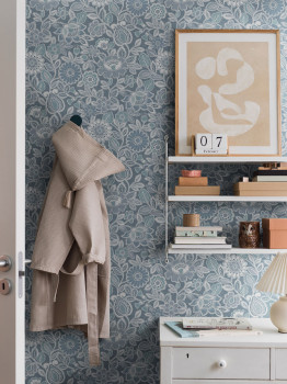 Non-woven wallpaper with a floral pattern with a retro touch in blue tones.