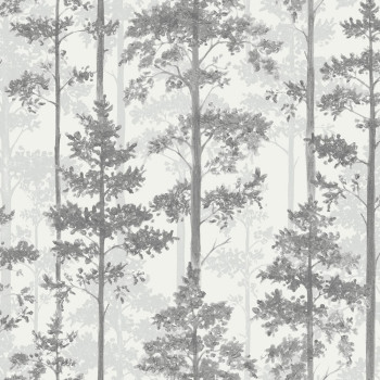 Non-woven wallpaper with a forest pattern, trees in shades of green and grey-green.