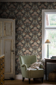 Wallpaper with a rich floral pattern in shades of brown, grey, beige and dusty pink.