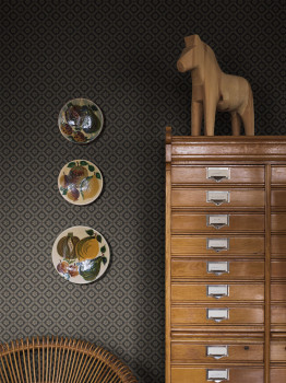 Non-woven wallpaper, grey-beige background, timeless floral grid pattern in shades of grey and black.
