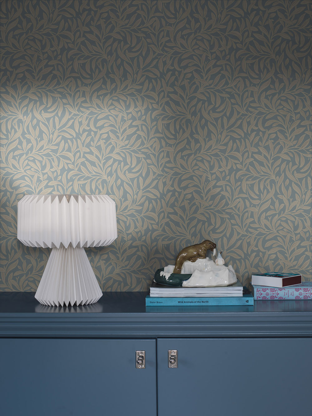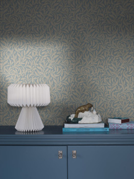 Non-woven wallpaper, light blue background, leaf motif in grey-cream tone.