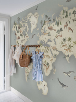 Mural wallpaper with a world map decorated with animals.