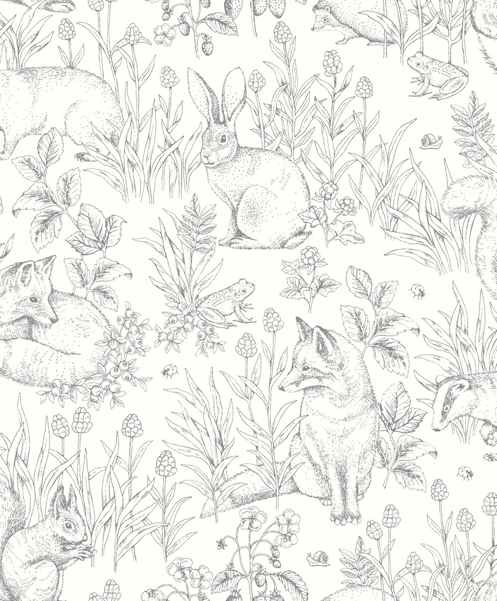 Children's wallpaper with a white background featuring black outlines of forest animals and plants.