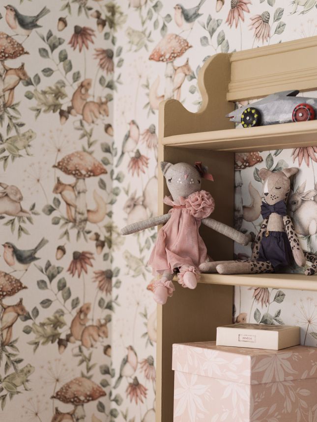 Children's wallpaper with a cream striped background featuring animals and plants.
