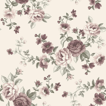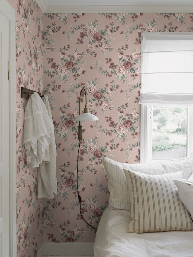 Wallpaper with a pink background and rose motifs in shades of green, burgundy, and pink.