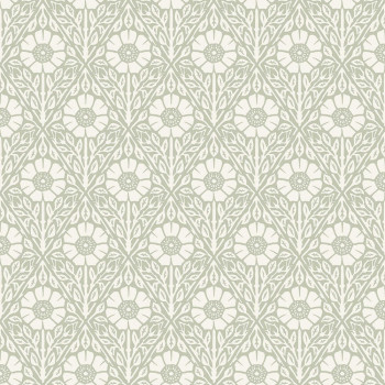 Wallpaper, muted green background, pattern of rose hips in a diamond design.