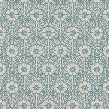 Wallpaper, blue background, pattern of rose hips in a diamond design.