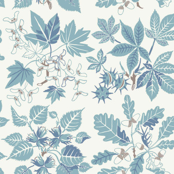 Wallpaper, cream white background, motif of branches of maple, hazel, chestnut and oak in shades of turquoise, blue and brown.