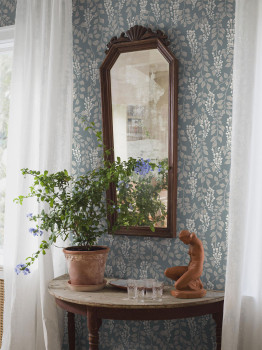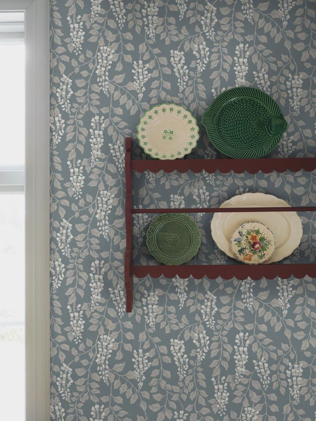 Wallpaper, blue background, blooming wisteria motif in greige and white shades.