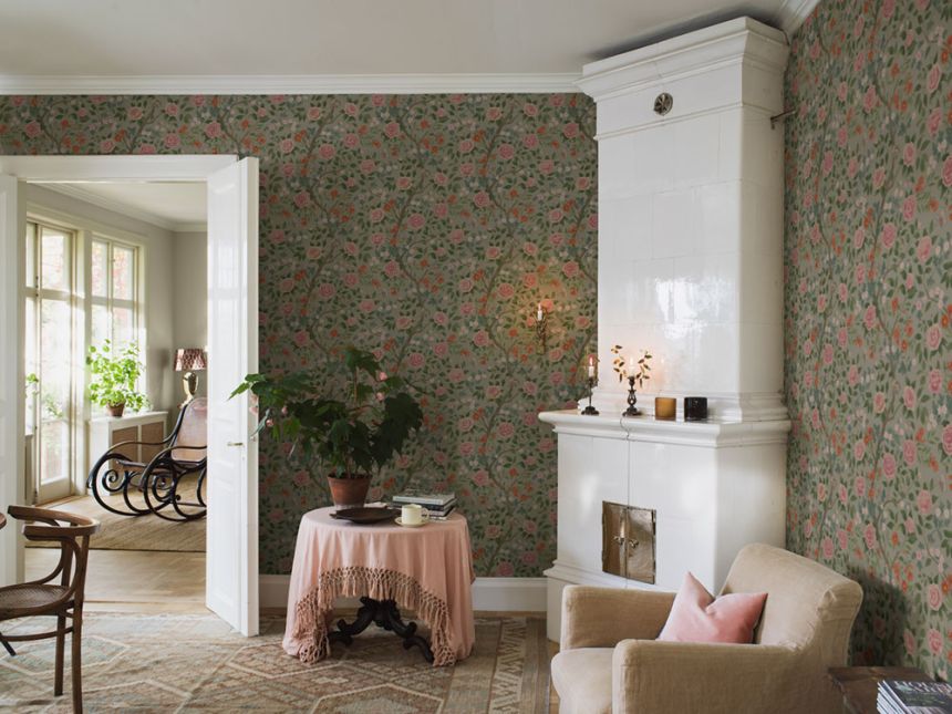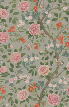 Wallpaper, khaki background, rich floral pattern with dominant camellias and butterflies – shades of green, pink, brown and brick red.