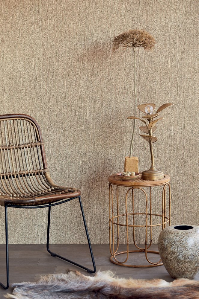 Non-woven wallpaper with a finely relief surface, bubble design in shades of beige and brown.