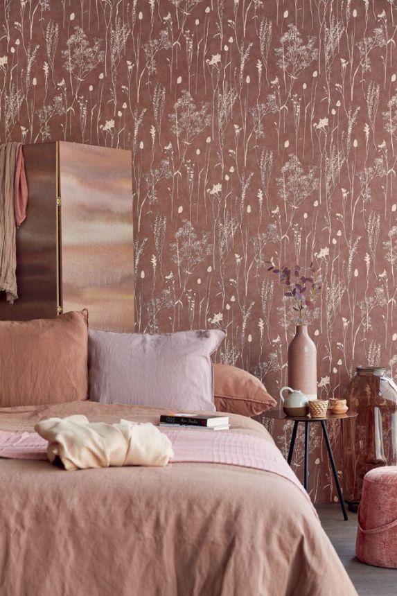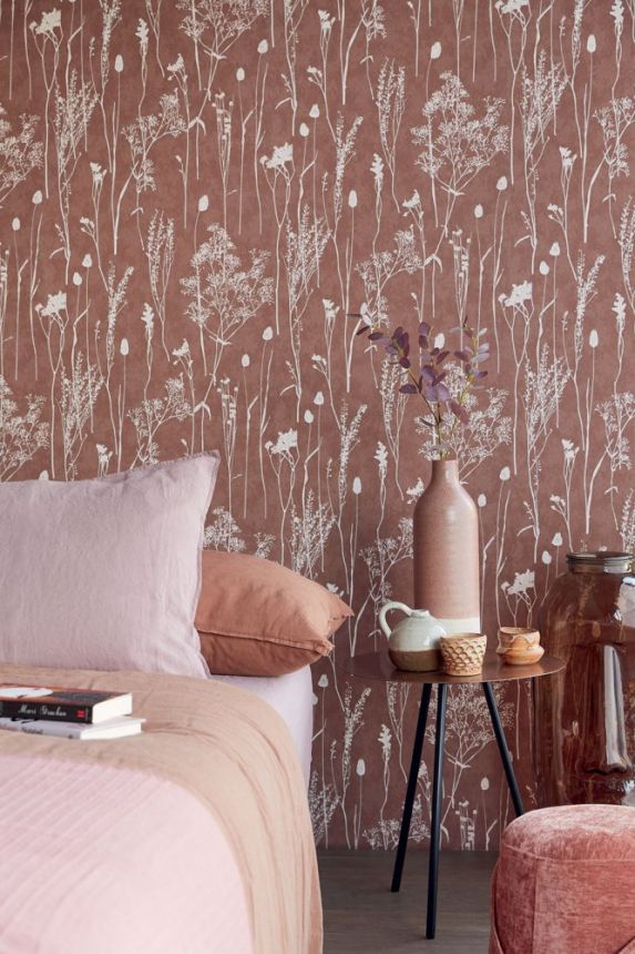 Non-woven wallpaper with a finely relief surface, meadow plants design in shades of white / old pink, terracotta background.