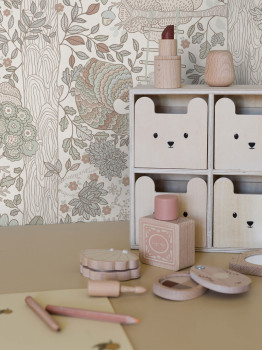 Wallpaper with a cream background, playful squirrel motif in soft pastel shades of green, beige and brown.
