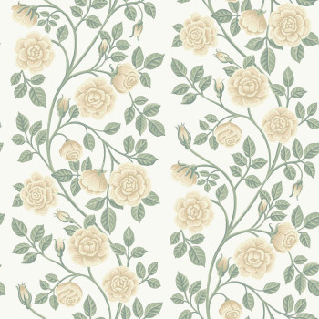 Non-woven wallpaper for walls, off-white background, panel pattern of painted roses in shades of green and cream-beige.