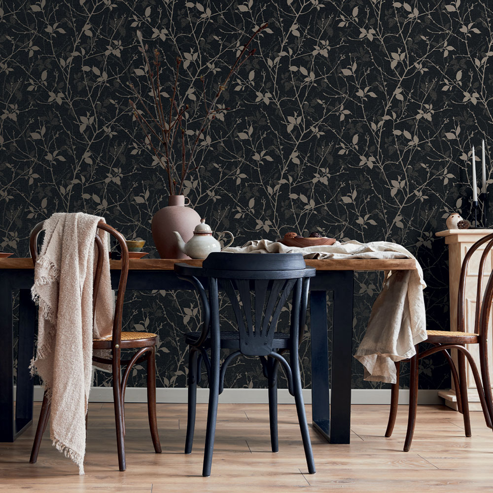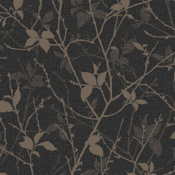 Wallpaper with a structured dark grey background, silver leaves and embossed semi-gloss brown accents.