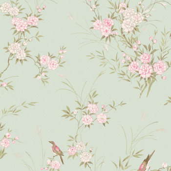 Non-woven wallpaper for walls, Chinoiserie inspiration, pastel green background, branches and birds in pink, brown and green shades.