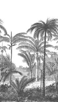 Non-woven mural wallpaper with vinyl surface, black and white palm landscape design.