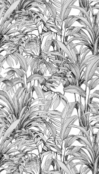 Non-woven mural wallpaper with vinyl surface, black and white tropical leaf design.
