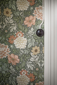 Wallpaper with a rich floral pattern in shades of green, beige and pink.