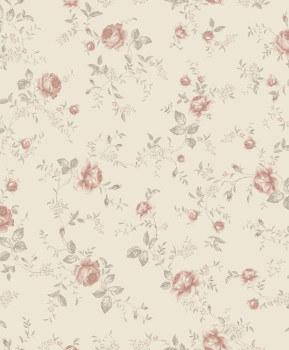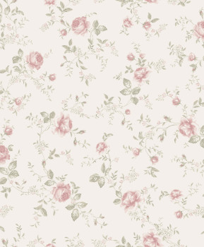 Wallpaper with an off-white background and rose motifs in shades of green and pink.