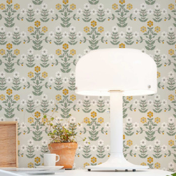 Non-woven wallpaper, grey background, floral motif in shades of green, ochre yellow and white.