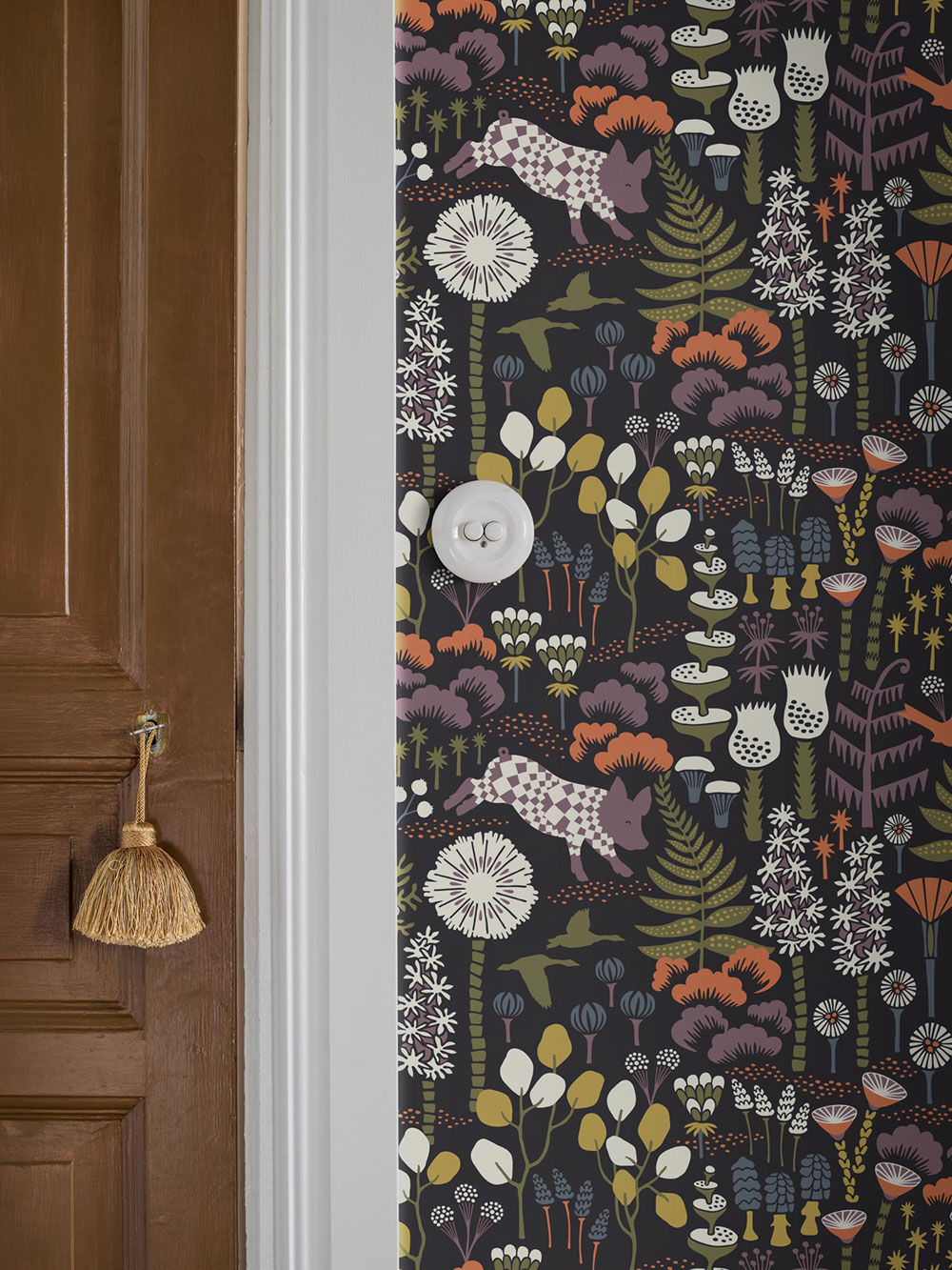 Wallpaper with a black background, stylish and playful design by Swedish designer Hanna Werning – colourful pattern with bouncing piglets among flowers and leaves.