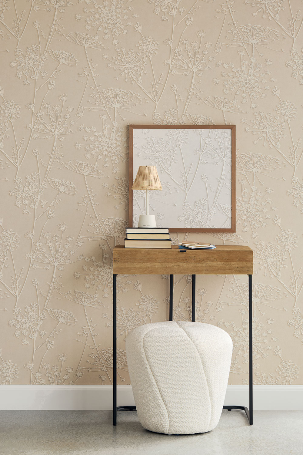 Wallpaper, pattern of blooming meadow grasses in beige and white shades – embossed texture.
