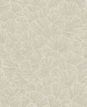 Wallpaper, ginkgo leaf pattern in greige / sand tones, subtle texture.