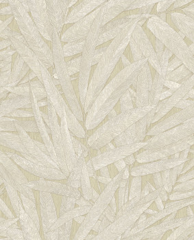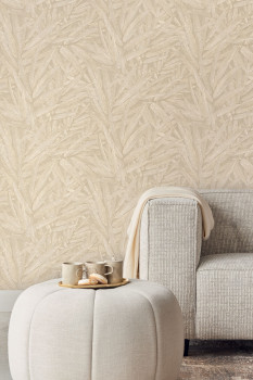 Wallpaper, leaf pattern in cream and beige tones, subtly embossed surface.