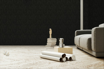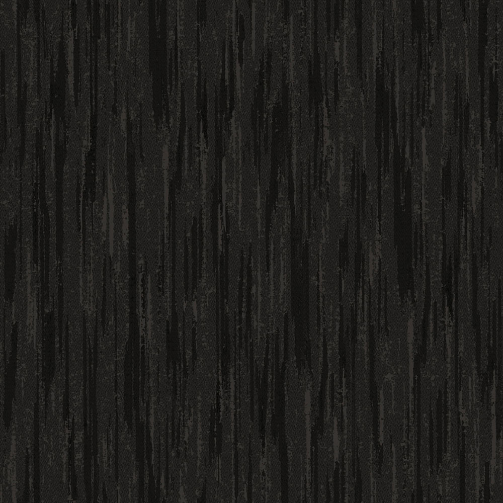 Non-woven wallpaper with vinyl surface, semi-gloss black shades with silver accents, design evokes coarse luxury fabric.
