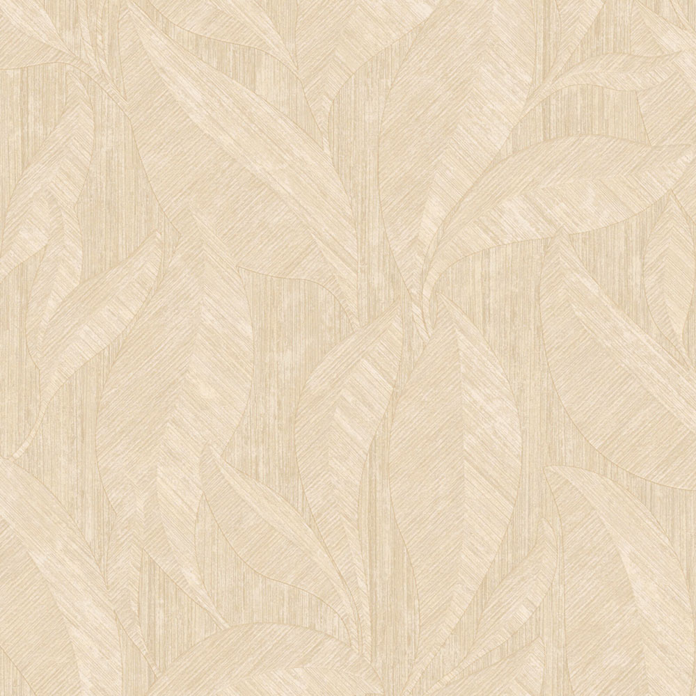 Non-woven wallpaper with vinyl surface, beige shades, subtle semi-gloss in places, embossed stylized leaves.