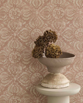 Non-woven wallpaper with vinyl surface, rougher texture, dusty pink and beige shades, ornamental print design.