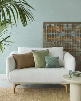Non-woven wallpaper with vinyl surface, fabric texture in turquoise tones.