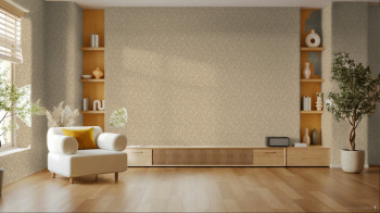 Non-woven wallpaper, subtly embossed ornamental floral pattern in brown and beige shades.