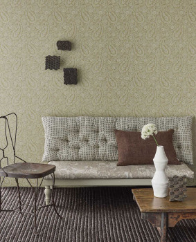 Non-woven wallpaper, subtly embossed ornamental floral pattern in green / khaki shades.