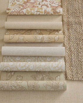 The collection includes elegant floral patterns, delicate ornaments and designs reminiscent of hand painting or vintage prints. Some wallpapers have a fabric-like texture, others resemble silk or naturally woven materials.