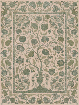 Non-woven mural wallpaper, blooming “tree of life” motif, shades of red, brown, green, and beige.