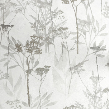 Wallpaper with a vinyl surface, white stucco background, motifs of meadow grasses and leaves in shades of grey, with occasional metallic silver accents.