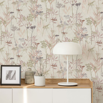 Wallpaper with a vinyl surface, white stucco background, motifs of meadow grasses and leaves in shades of pink, salmon and purple, with metallic gold accents.